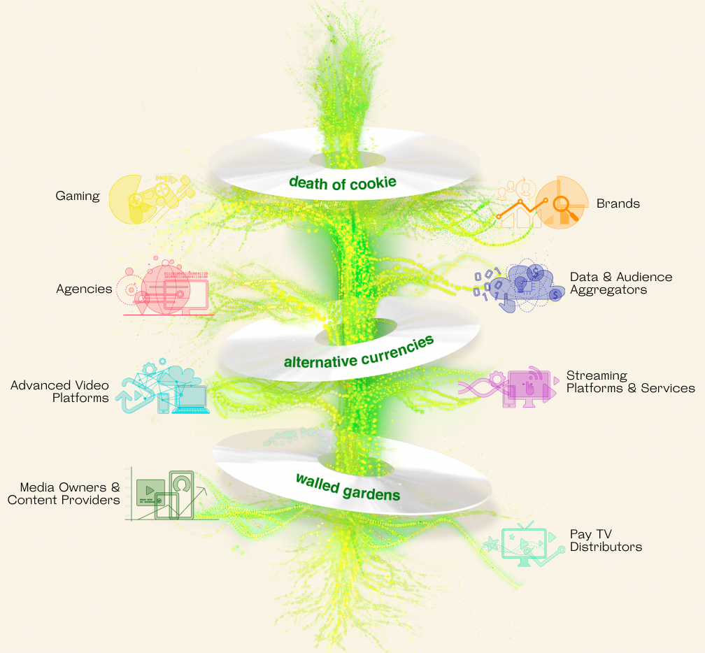 As such, an examination of this change must occur in order to introduce new approaches to measurement. Three key components inform this changing media landscape: the death of the 3rd party cookie, the proliferation of walled gardens across the media ecosystem, and the emergence of new trading currencies. Each of these three forces presents unique challenges to the existing paradigm, and together create a complex new paradigm that must be addressed.